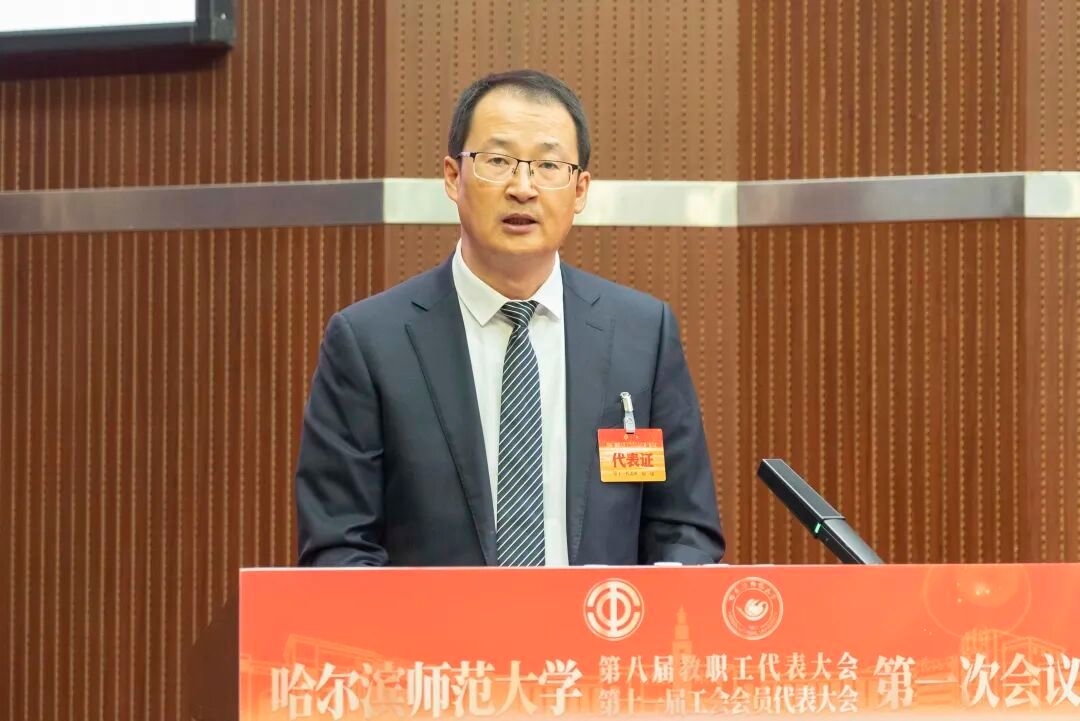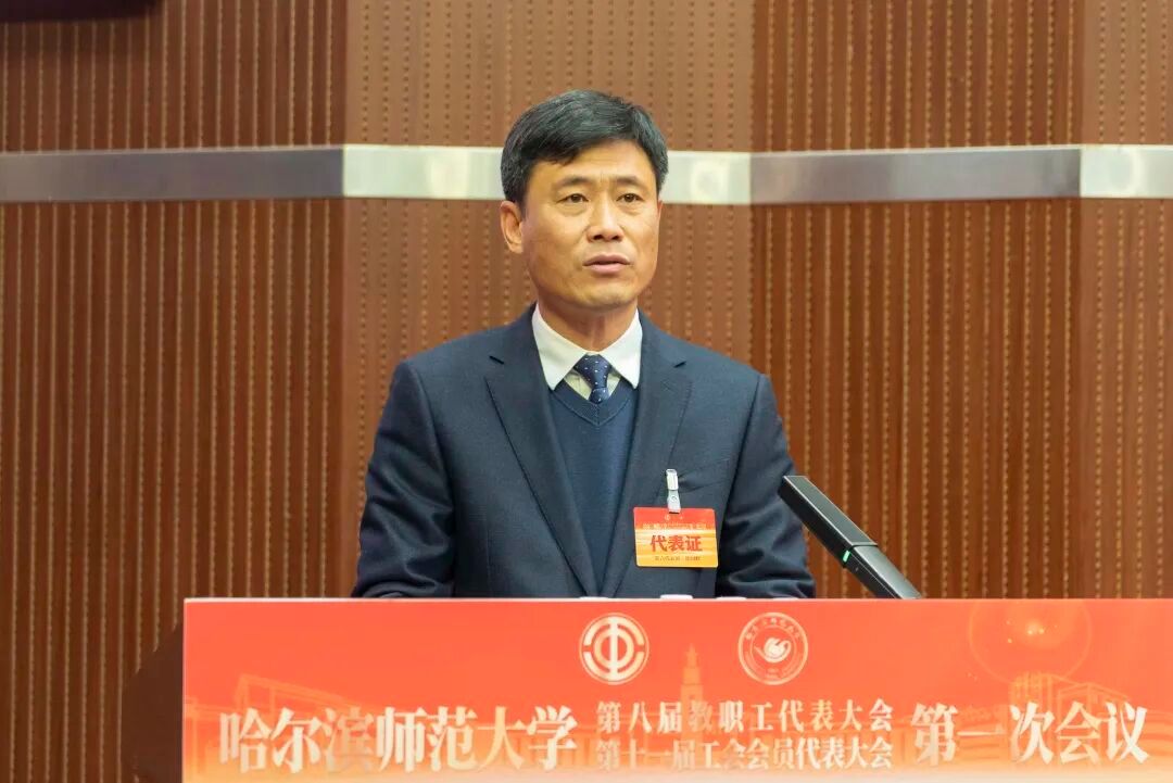 蒋鲲作题为《加快推进“国内一流师范大学”建设 为教育强国与教育强省建设贡献哈师大力量》的工作报告。