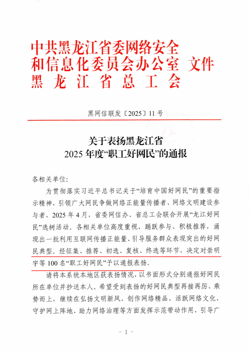 本次“龙江好网民”选树活动以“培育中国好网民,传播龙江正能量”为主题,围绕弘扬文明新风、创作网络精品、活跃网络文化、守护网上阵地、助力网络治理五个维度遴选先进典型,旨在引导广大网民争做网络正能量传播者、网络文明建设参与者。崇明宇经过学校推荐、省级初选、终选等多轮评审,凭借扎实的网络实践成果脱颖而出,成为全省职工群体中的优秀代表。