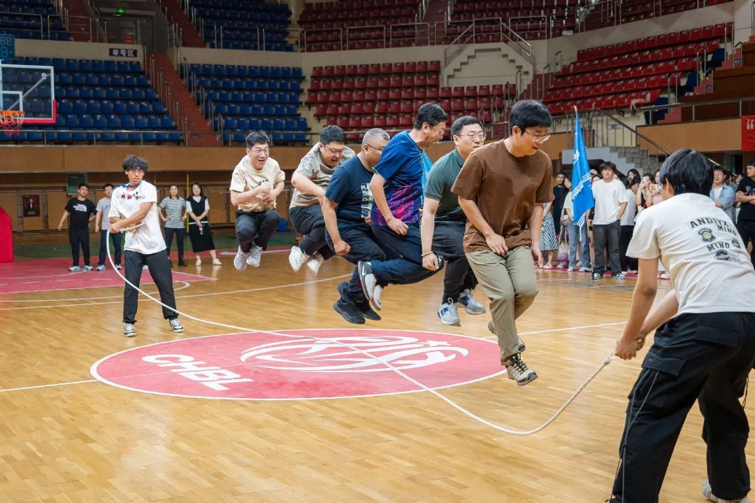 在惊心动魄的1分钟时间内,在快速跳动的长绳间,老师们配合默契、动作敏捷,完美演绎了团队节奏与协作的共振。每一次跳跃,都伴随着欢声笑语,彰显着活力与团结。